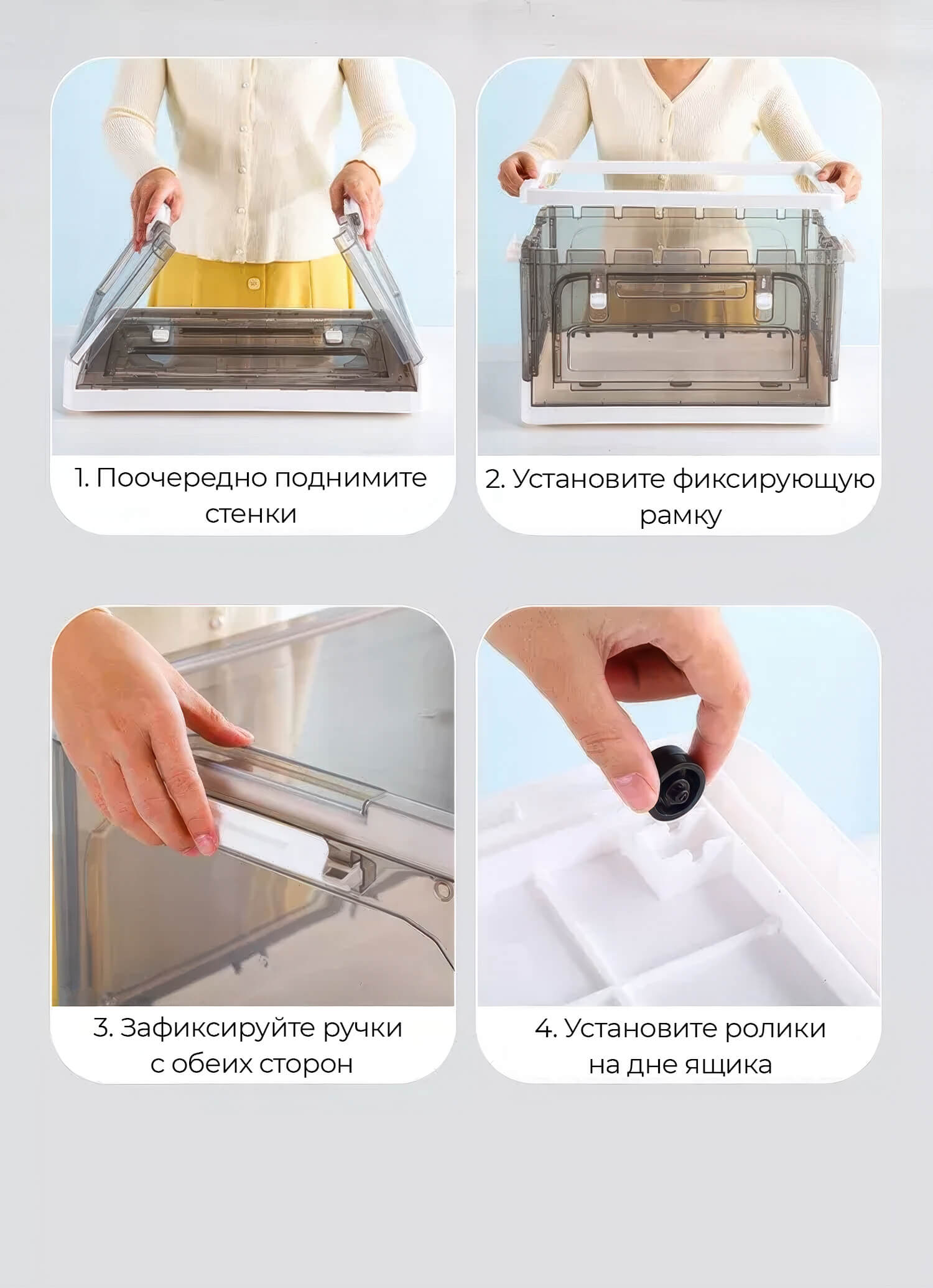 Пластиковая коробка с крышкой защищает вещи от пыли и влаги, обеспечивая чистоту и порядок. Прочная конструкция гарантирует долговечность, а складной механизм позволяет экономить место, когда контейнер не используется.